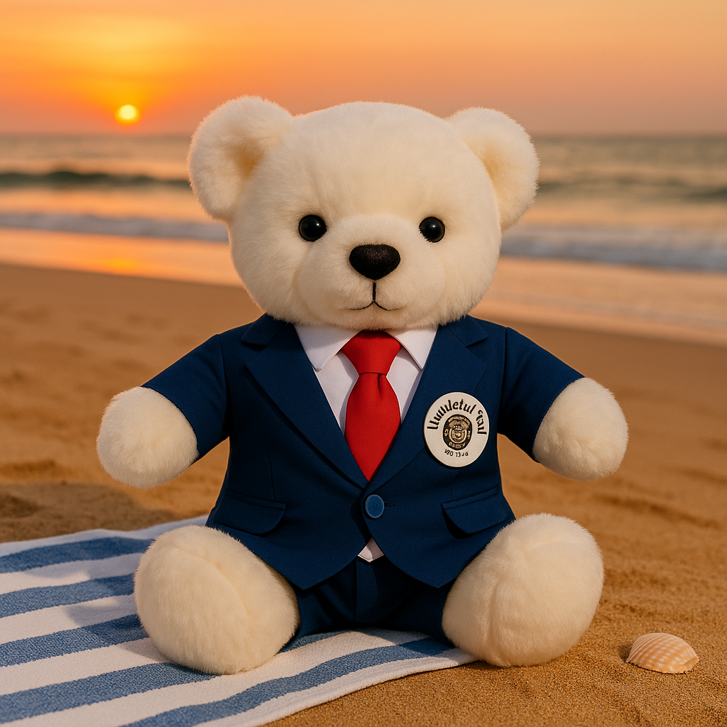 Mr. Elegant, ursulețul alb de 25 cm, îmbrăcat într-un costum bleumarin și cravată roșie, cu opțiunea de mesaj vocal personalizat. Cadoul perfect pentru momente speciale! 🧸💙