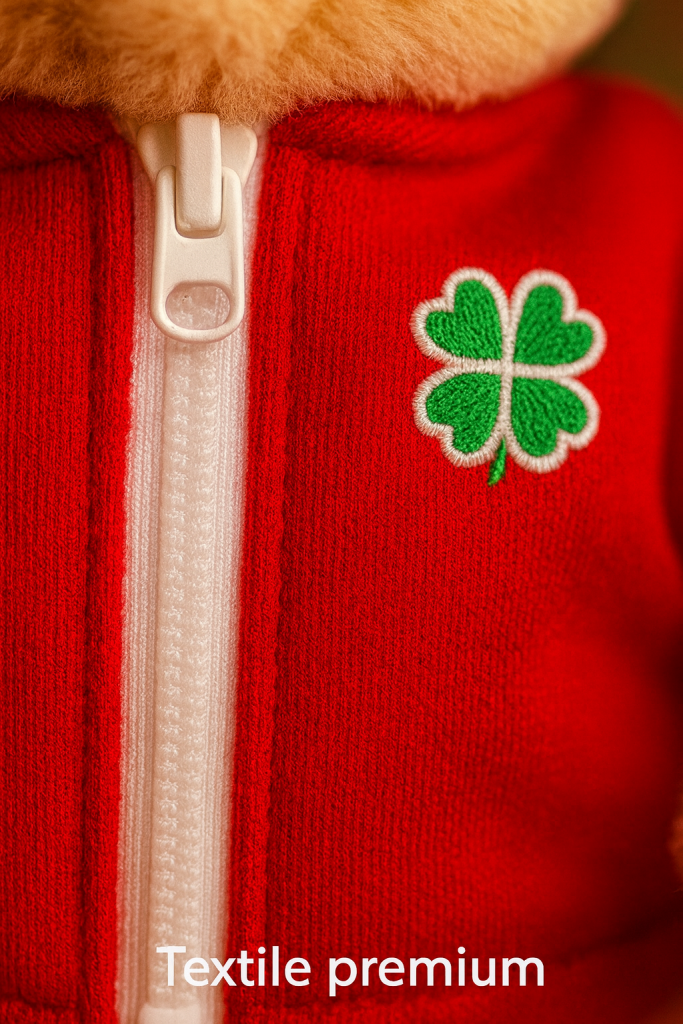 Descoperă combinația perfectă între emoție, calitate și personalizare! Ursulețul Norocos de 30 cm vine îmbrăcat într-un hanorac roșu cu fermoar funcțional și broderie cu trifoi în 4 foi – simbol al norocului și bucuriei.