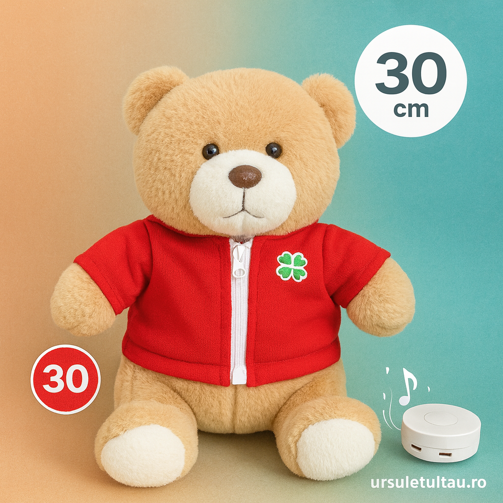 Un ursuleț adorabil, îmbrăcat într-un hanorac roșu cu trifoi norocos brodat, care transmite emoții adevărate printr-un mesaj audio personalizat. Cadoul perfect pentru orice ocazie specială!